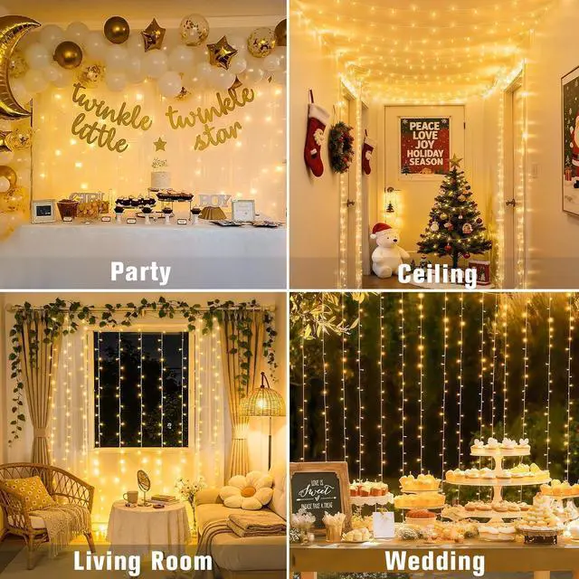LED Curtain Lights (unconnectable): The warm white LED fairy curtain lights feature 10 strings of lights each with 30 LED bulbs. The 9.8 x 9.8 ft size is large enough to cover most windows and walls creating a wider and more impressive lighting effect. The curtain lights are perfect for indoor and outdoor decorations and will make your home shine! Please note that multiple sets of curtain lights cannot be connected. 8 Lighting