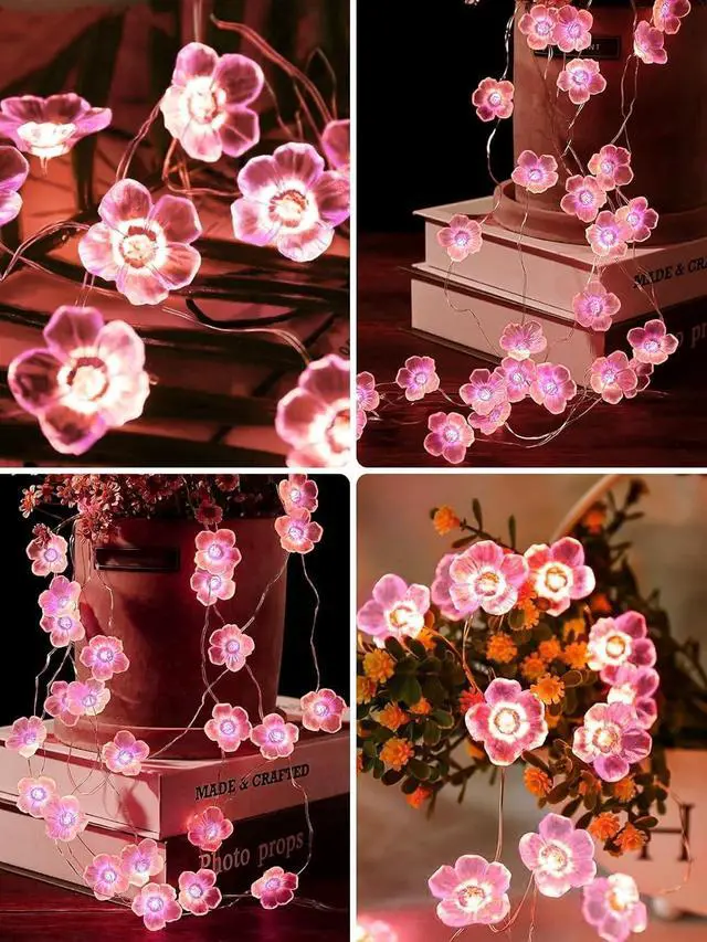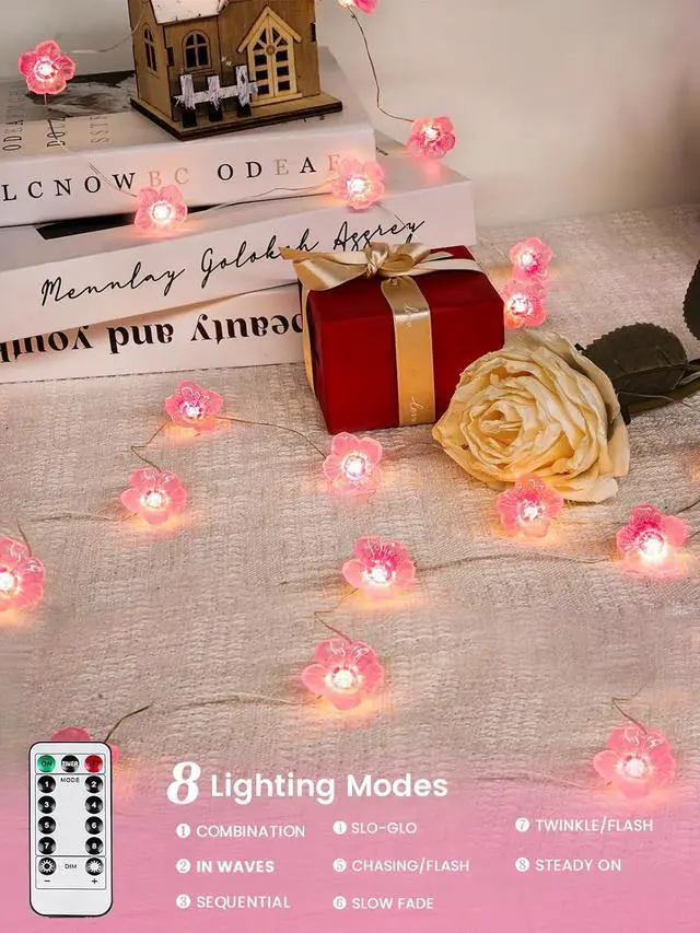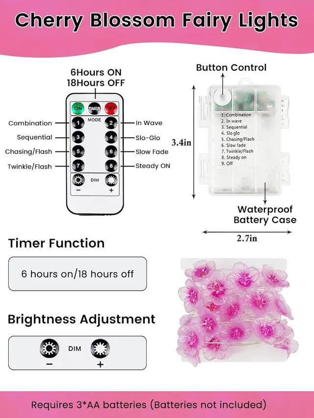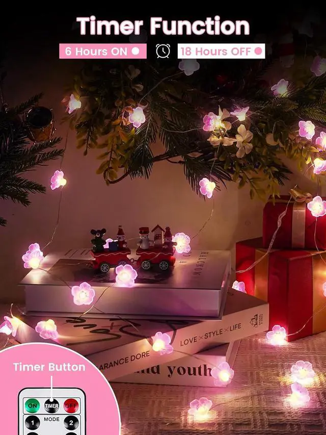 Cherry Blossom Flower Decoration Lights: This pink fairy lights string features small 3D cherry blossom-shaped covers that emit a soft pink glowadding a warm and romantic ambiance that's great for gatherings and home decor. The length of each string lights is 10ft with 30 LEDs and each strand includes a waterproof battery case and a remote control and is powered by 3 AA batteries (not included) Flexiable and Cuttable