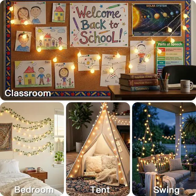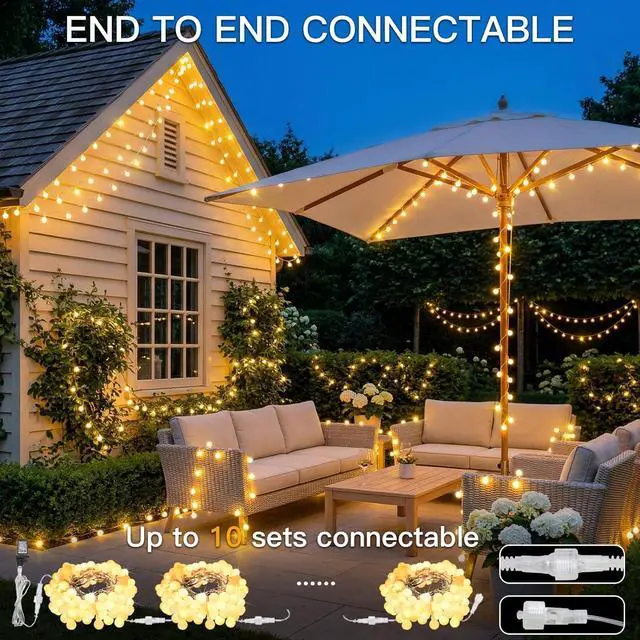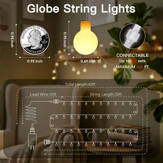 Expandable 43ft Length & Connectable DesignThe globe string lights include 33ft white fairy lights + 10ft lead wire. Connect multiple strands to effortlessly decorate large spaces like wedding arches garden fences or holiday displaysno extra outlets needed. For covering very large areas our 200 LED or 300 LED string lights are ideal. With more LEDs per string these lights allow you to create a brighter more continuous lighting effect. Create Your Cozy Retreat Frosted globe bulbs lights emit a soft inviting glow instantly transforming dorm rooms bedrooms or reading nooks into serene sanctuaries. The transparent wire disappears into your decor while the warm white light calms the mindperfect for unwinding after a long day sharing bedtime stories with kids or crafting a peaceful study corner.
