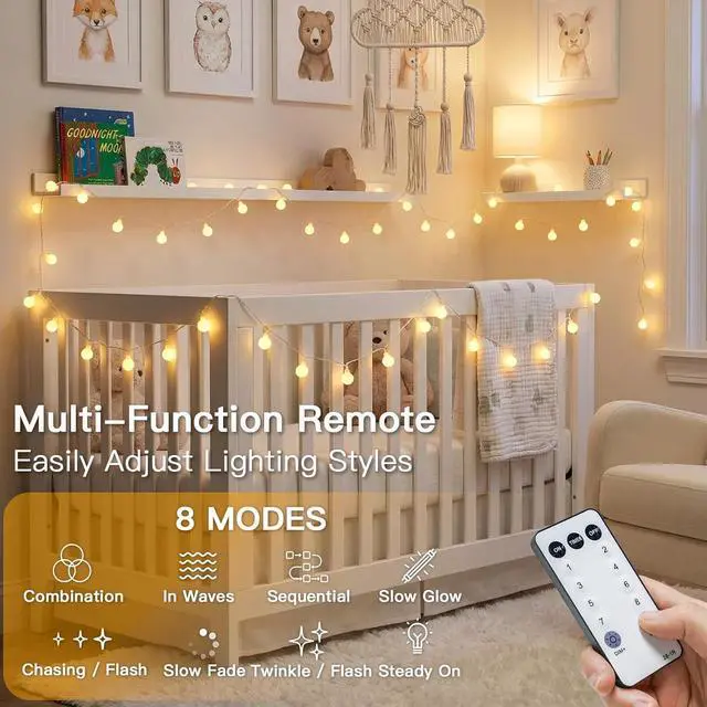 Let these lights wrap your space in warmth where every flicker whispers Home Sweet Home. 8 Lighting Modes & Remote ControlThe string lights indoor allow you to switch from a steady glow for dinners to a twinkle for holidays using the remote. Additionally the 6-hour timer (on) /18-hour (off) feature saves energy making them ideal for bedtime stories or overnight holiday lighting. IP44 Waterproof & UL CertifiedThese UL-certified plug in fairy lights are designed for bedroom safety with an IP44 waterproof rating can withstand drizzle allowing you to leave them hanging even on rainy days. The low-voltage heat-resistant bulbs stay cool to the touch ensuring they are safe for children pets and suitable for 24/7 indoor/outdoor use.