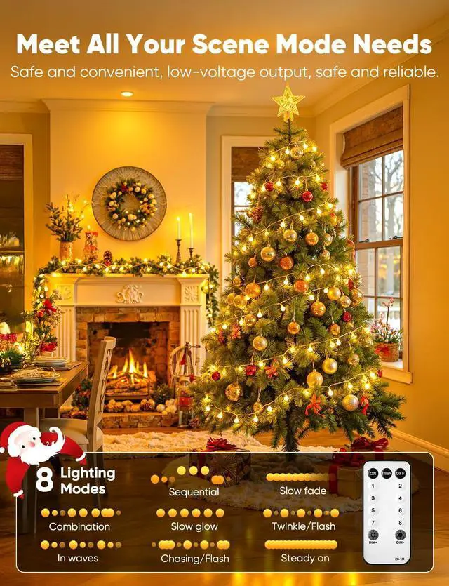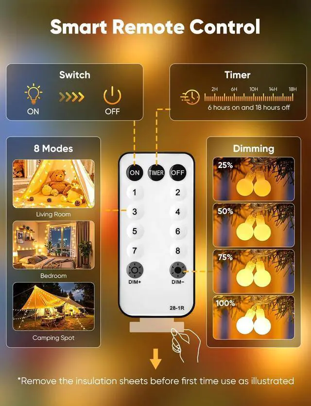 Mode Lights: The rv globe lights have 8 lighting modes namely combination in waves sequential slo-glo chasing or flash slow fade twinkle and flash and steady on. The rv outdoor lights also have a memory function allowing you to set your specific mode and use the timer function on the remote to turn on the lights for 6 hours and off for 18 hours automatically every day.