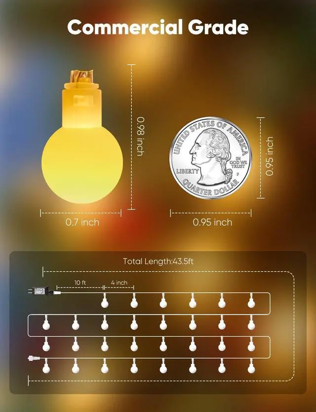 Commercial quality string lights: The globe around the lights are shatterproof because they are made out of plastic. 100 led bulbs give off a warm white light. An ul listed power adapter comes with the lights. Diameter of the bulb is 0.7 inch and the spacinga between bulbs is 4 inchesTimer Functions and 8