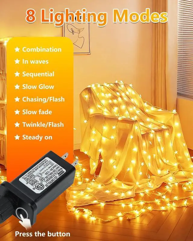 High Quality: 100 LED 49 FT star shaped string lights with solid construction plastic material adapter powered. 30 V low voltage string lights with UL 588 certified for safety use.