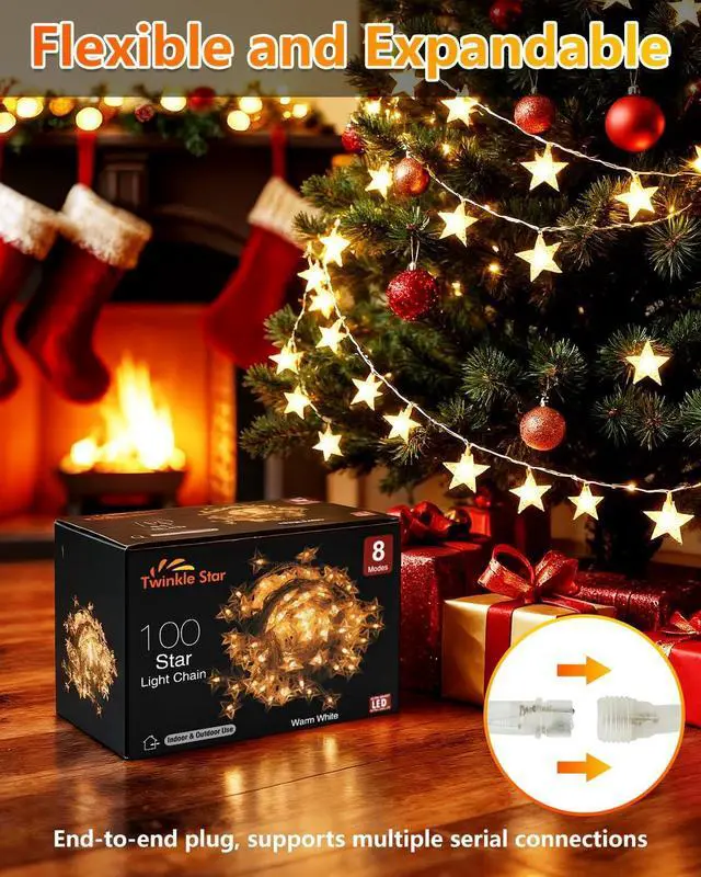 m/33 ft length totally: 15 m/49 ft approxExtendable- LED Star String Lights with Male and Female Safe Plug could be extended to a maximum of 10 light chains from 49.2 ft to 344.5 ft (maximum 1000 LED). Please note that the transformer is IP 44 waterproof so it can meet normal use outside but not enough to put under water directlyIP44 Waterproof and