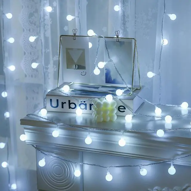 Globe String LightsThe white Led string lights come with frosted globes can create a soft cosy light to take care of your eyes. So the lighting effect of the frosted ball is irreplaceable by other LED string lights. The cute string lights indoor provide a fun feel for room aesthetic to the bedroom dorm classroom living room. The globe around the lights are shatterproof it create a unique relaxing and soothing indoor atmosphere and enhances the durability of the string lightsMulti-Function Remote ControlThe white lights string indoor comes with a smart remote allowing you to easily run 8 modes timer ON/OFF and adjust brightness to achieve the desired lighting effect.