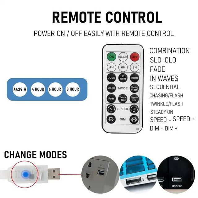 Different Lighting Modes: Create the perfect ambiance with 8 lighting modes choose from combination slow glow wave sequential chasing/flash slow fade twinkle/flash and steady on. Easily switch modes by the remote control. USB Plug in and