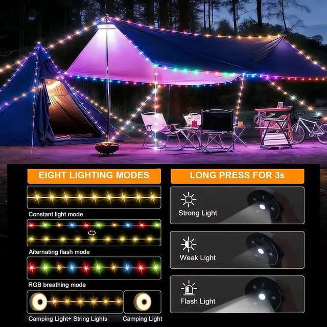 8 Lighting Modes: The outdoor camping string lights offer 8 modes - warm string lights RGB alternating flash RGB breathing camping warm lights camping glare lights XTE strong light XTE weak light XTE SOS flashing lights. They are perfect for outdoors camping backyard hiking awnings tents gardens parties festivals and decorations.