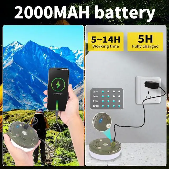 Battery Indicator: The camping light has a built-in 2000mAh battery. After charging for 5 hours the camping light can work for 5 to 12 hours depending on the selected mode. During charging the power indicator flashes blue to clearly show the charging status and it can also charge your phone.