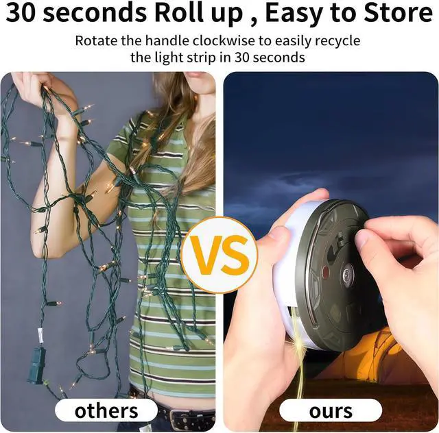 Portable Storage: The camping lantern weighs only 7.4 ounces making it very lightweight and portable. It can be easily placed in a backpack or handheld device. With a quick turn of the handle and manual device the 32.8FT light string can be restored to the camping lantern in just 30 seconds. The clever design of the camping light string ensures portable storage. Undoubtedly this is a camping essential. USB Charging and