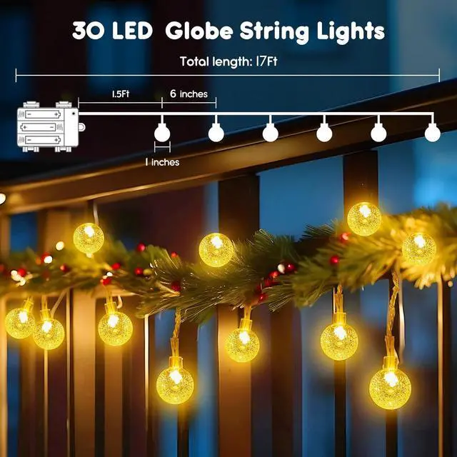 Battery Crystal Globe String Lights with Remote - Powered by 3 × AA batteries ( not included ) Minetom crystal globe fairy string lights are 17 feet long with 30 bright LEDs. The thin clear wiring and lovey crystal globe-shaped LED bulbs will add a delicate and romantic touch to your personal space. Upgraded Bigger Crystal Globe-shaped Bulb - Minetom upgraded globe string lights have a larger bulb size. Each crystal globe is about 1 inches wide with durable waterproof plastic construction which is much bigger than most similar products ( only 0.6 inches ) on the market.