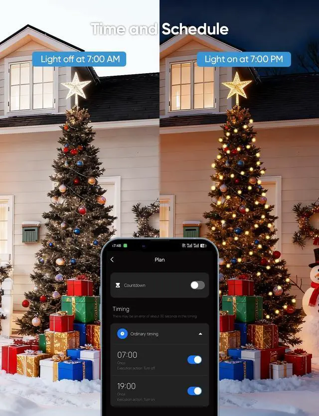 (Note: Compatible with 2.4 GHz Wi-Fi only)Timer & Adjustable BrightnessIntelligent timing can make the outdoor tree lights turn off or on automatically after any set time; you can set different switching time according to different time. Please note that the timer function must be set in the smart app and cannot be activated automatically. Brightness and flash speed adjustable from 1% to 100% to meet different lighting needs day and night.