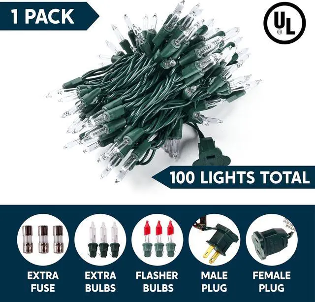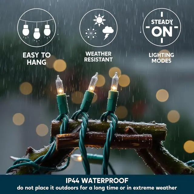 UL588 CERTIFIED FOR INDOOR & OUTDOOR SAFETY - Ensure holiday peace of mind with our string lights rigorously tested to meet US UL safety standards. The IP44 waterproof design and durable construction withstand rain and snow making them perfect for Christmas tree decorations garden patio and year-round use. 100 WHITE MINI LIGHTS - Our Xmas string light outdoor total lighted length is 19.4 feet. Total wired length is 21.4 feet. Clear bulb spacing 2.36 inches. Create a magical atmosphere with Old-fashioned tradition bulbs emitting a classic festive glow. The white lights is cozy offer a vibrant joyful display for any celebration.