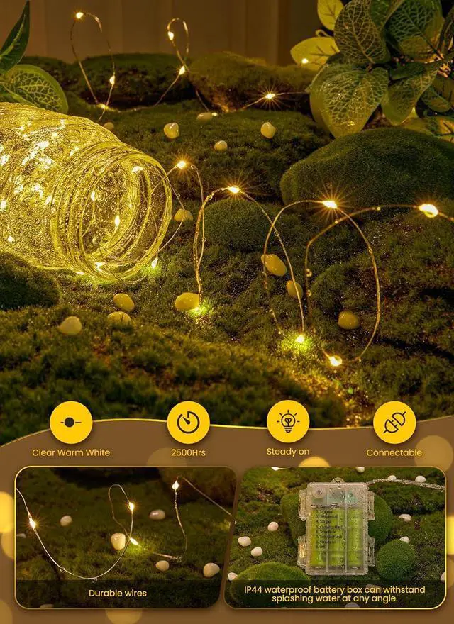 Portable & Waterproof Design These fairy lights battery operated are perfect for areas without outlets or during power outages. Featuring an IP44 waterproof battery box and durable LED bulbs they shine brightly even in wet weatherideal for Christmas weddings and outdoor décorFlexible & Durable Silver Wire Made with high-quality silver wire these 33ft twinkle lights indoor are easily bendable and hold their shapeperfect for wrapping around trees furniture or DIY decorations. Theyre ideal for indoor and outdoor useTimer & Remote Control Automatically turns on the christmas lights battery operated for 6 hours and off for 18 hours in a 24-hour cycle.