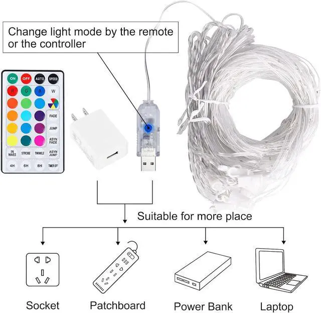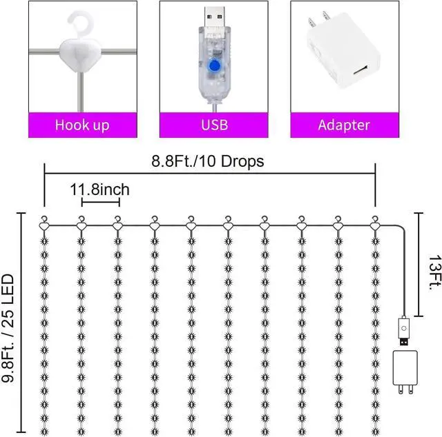 Time button: 6 hours working rest for 18 hours. USB & Adapter - The USB can plug in any USB port such as the power adapter attached USB hub computer laptop TV or mobile power. The button on the USB receiver can also select different modes. Easy to install & Waterproof - Do not unwrap the individual strand until you have set up the main string. IP44 waterproof (expect controller and adapter) which make them can be used in outdoor. Specification - 8.8 feet main string 10 strands of 9.8 feet dropping string. Every strand with 25 LED totally 250 LED. Package included 1 adapter 1 remote 1 curtain lights with USB controller.