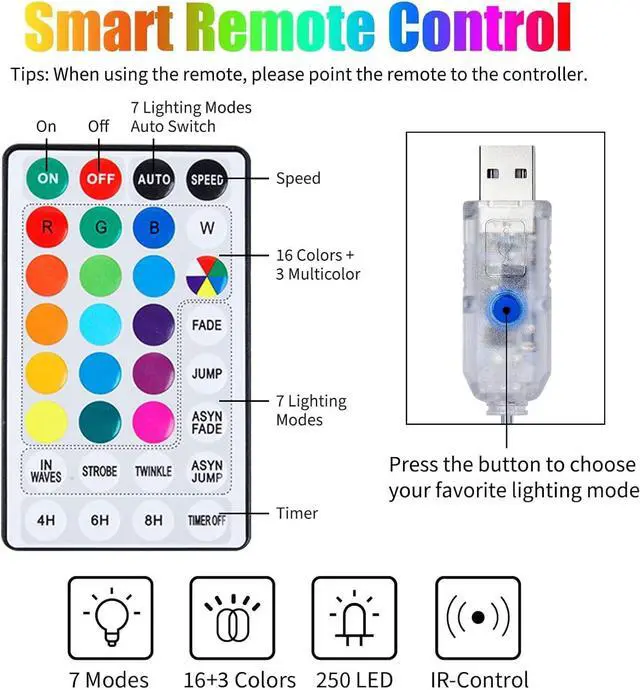 Multicolor - 16 wonderful colors and 3 colorful lights in one set the curtain string lights are wonderful decor for indoor outdoor bedroom window dorm party wedding birthday Christmas. Remote Control - 32 key 7 Lighting modes. Point at the USB port when operating the remote control.