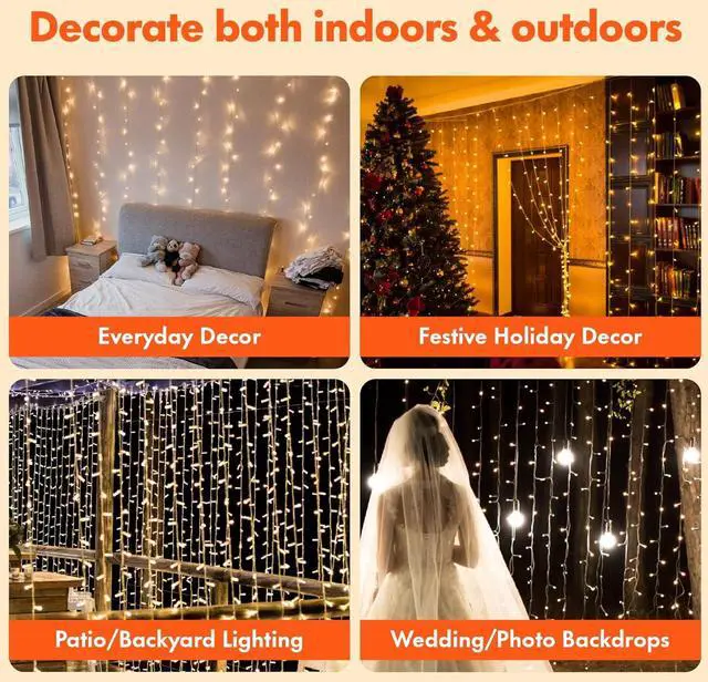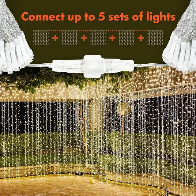 LOVELY LIFE ENHANCEMENT: Indulge in the magical and mesmerizing ambiance created by the enchanting glow of these LED curtain string lights. It is primarily intended for curtain decoration allowing you to add a touch of magic and elegance to your space. NOTE 1 - The transformer and mode controller of these curtain lights are waterproof IP44. While they can withstand normal outdoor use please note that they should not be submerged directly in water. If you plan to use them outdoors it is recommended to use a waterproof receptacle cover for added protection. NOTE 2 - The White buckle provided is intended for fixing the main power cord line. It is important not to cut the cord as doing so will result in the separation of the string lights.