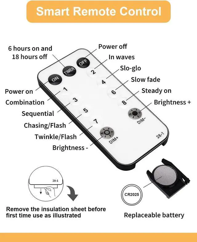 Come with a 13-key remote that integrates a timer and dimmer. You can set 6 hours on and 18 hours off or adjust the brightness to 25%/50%/75%/100% using the remote. Twinkle lights will memorize your last setting even if unplug the power.?? Waterproof & Easy Installation? These plug-in fairy lights rate IP44 dustproof and waterproof suitable for both indoor and outdoor use. Lights are plug-and-play and extendable with an end-to-end connector. Lights string is well packed to prevent tangling and easy to install with cable ties clips cup hooks or grippers.