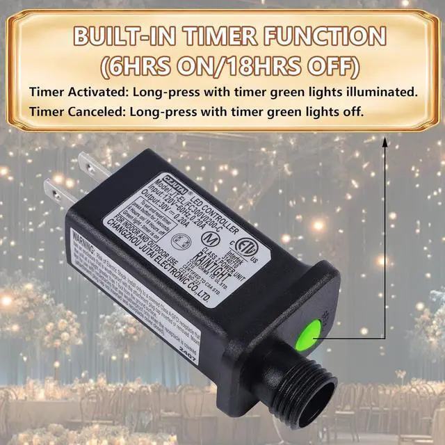 8 Lighting Functions: Our Halloween string lights have 8 lighting modes: combination in waves sequential slogs chasing/flash slow fade twinkle/flash and steady on. Fit different occasions moods feelings holidays festivals anniversaries etc. Pressing the round button on the transformer to change the lighting modes. 29V low voltage green wire string lights can keep at a low temperature state after lighting up for hours ensure and maximize the safety. Directly plug in and unplug it for power on and off. US standard outlet voltage 110V. Adapter to the first