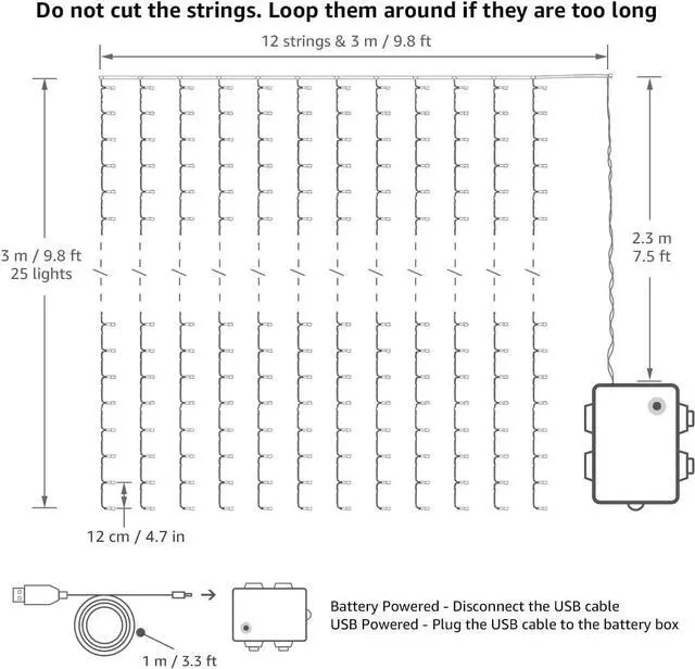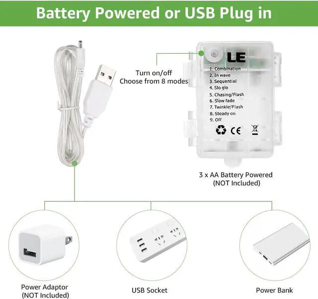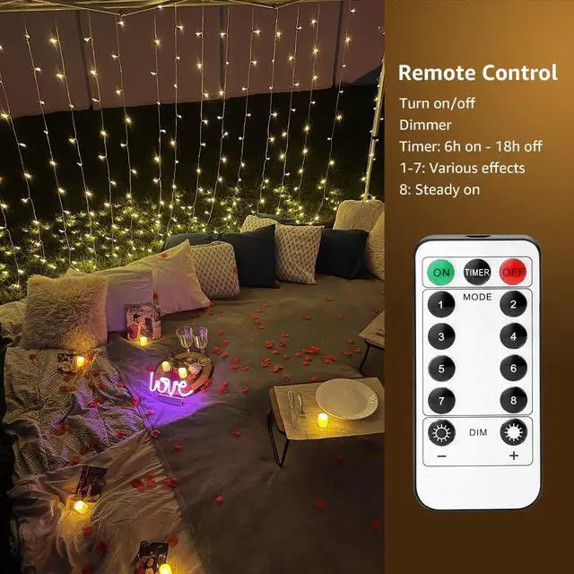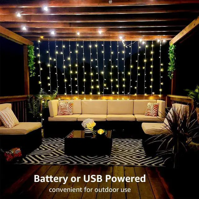 No access to any outlets? Never mind. It doesnt even need an electricity connection. Battery Powered. Use 3 AA batteries (not included) and then you can use them almost anywhere. USB Powered. Hook up the USB plug to a power bank. You can also plug in these curtain twinkle lights in a USB port hub outlet or use a regular USB phone charger base (not included) Remote & Dimmable. Turn on/off choose from the different lighting patterns and adjust the brightness levels remotely. Timer. When you press the timer button on the remote controller the lights will start going into an automatic 6 hrs on and 18 hrs off cycle.