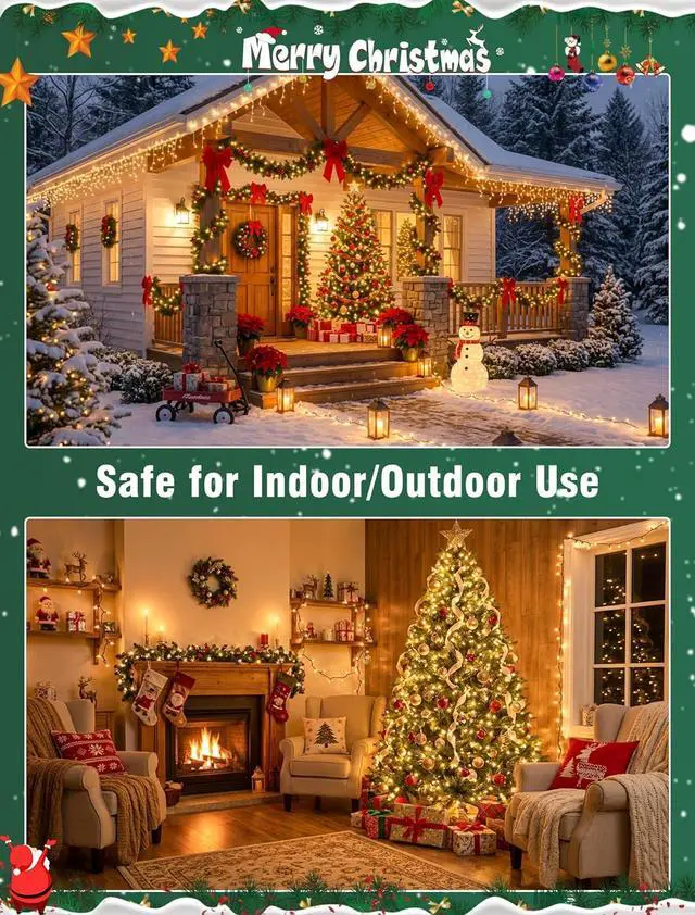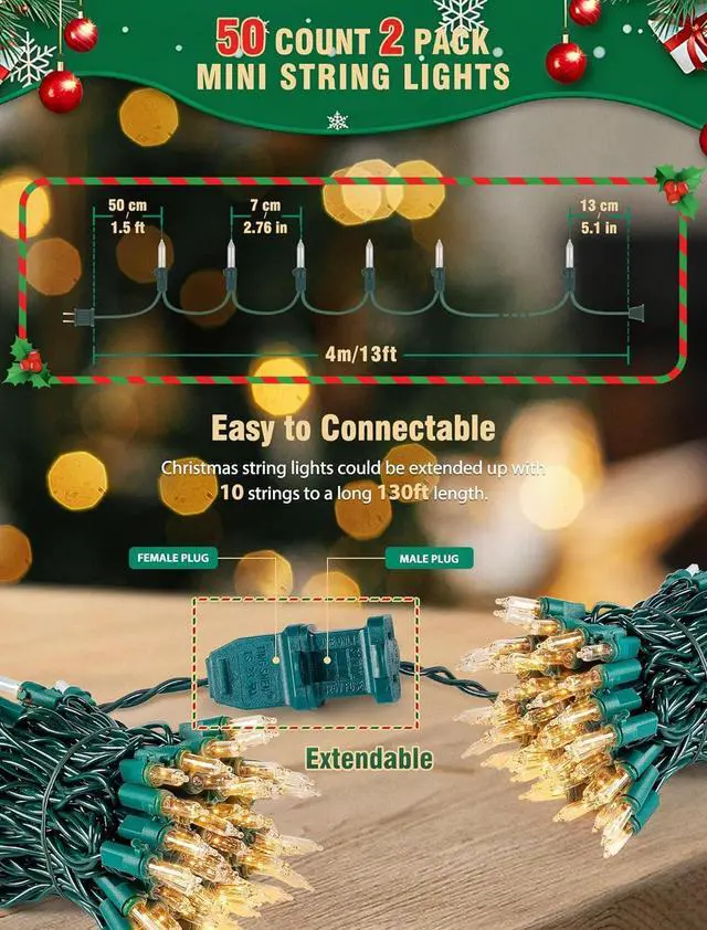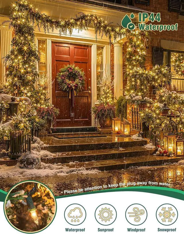 Connectable: With the end connector Christmas tree lights could be extended up with 10 strings to a long 130 ft length allow you easily installed without additional tools and decorate your lighting area with the desired lengthWaterproof DesignIP44-rated waterproof Christmas lights green wire for outdoor use in snow or light rain. Safe to hang on wreath window stairs patios gardens or trees without worrying about water damageSuperior Quality with