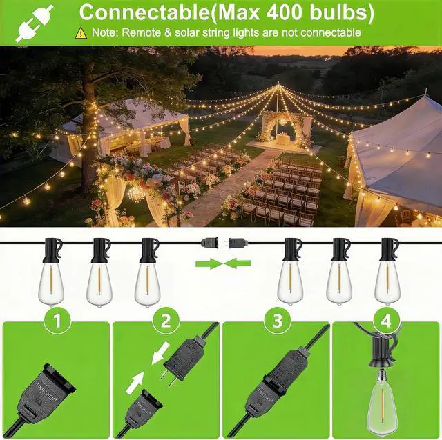 Notice: The voltage of this light string is 120V and cannot be connected to the remote control light string. Waterproof & ShatterproofProfessional waterproof technology ensures that these durable outdoor lights can withstand rain fog humid environments and sunlight and can be hung year-round without disassembly. Our string lights bulbs are made of high-hardness shatterproof plastic material to replace fragile glass and eliminate safety hazards. Families with the elderly children and pets can use it with confidenceUltra-long Life & High Energy SavingThis 100FT string lights for outside has a service life of up to 30 000 hours saving 90% of electricity bills than incandescent lamps. It does not need to be replaced frequently and long-term use saves money; damage to a single bulb does not affect the use of other bulbs and it is more economical and easier to replace it individuallyCreate a Warm AtmosphereThis outdoor lights for patio uses 2500K soft and warm white light. The light is warm and non-glaring creating a warm and romantic atmosphere for courtyards and terraces. Whether it is daily leisure friends' gatherings or holiday decorations it can quickly create a warm and relaxing high-end style. It is suitable for daily leisure friends' gatherings holiday decorations and other scenesEnd-to-end Series Design Supports seamless extension of multiple outdoor light from the corner of the courtyard to the outdoor party scene you can freely expand the lighting coverage and the length can be flexibly adjusted without additional adapters; these easy-to-use backyard lights outdoor are exquisite decorations for your garden bistro balcony terrace pergola pavilion tent pool umbrella cafe bedroom market wedding birthday Christmas party and other occasionsEasy to Install & Widely ApplicableThis patio lights outdoor waterproof with a built-in power plug can be easily hung wherever you want to decorate without the need for any special tools; all products undergo rigorous testing to ensure quality and safety.