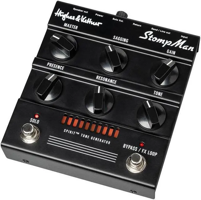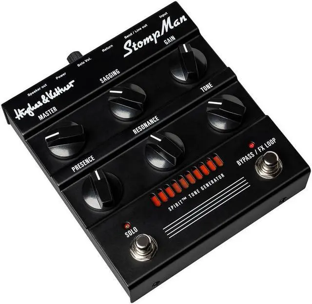 connection options, the StompMan is the perfect hub for every pedalboard and an ingenious go-to/always-on amp for every occasion. a full-featured, single-channel amp with up to 50 watts of amp power. In addition to an FX loop and a clever solo function, it offers a bypass switch that is unique in this class, allowing it to bypass the internal preamp so that you can optimally operate other preamp pedals or even modelers with the StompMan, yet leaving the Presence, Resonance and Sagging power amp sound parameters at your disposal.