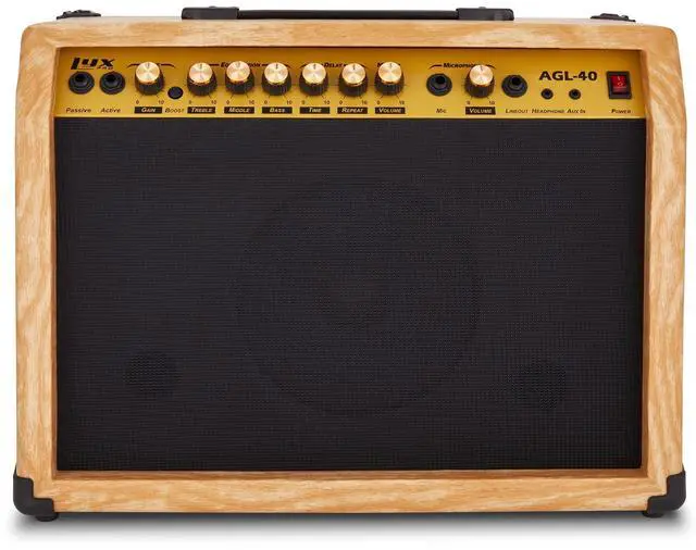LyxPro 40 Watt Electric Guitar Amplifier | Solid State Studio Amp with 8 4-Ohm Speaker, Custom EQ Controls, Drive, Delay, ¼ Passive/Active/Microphone Inputs, Aux In & Headphone Jack - Natural
