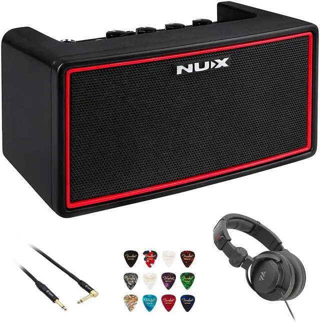 Mighty Air Wireless Guitars Amplifier NUX Mighty Air is a wireless stereo modelling guitar / bass amplifier with Bluetooth connectivity and a dedicated app to enhance your tone from your mobile devices. It can serve you for bedroom practice, pre-show warming up, travel entertainment and more. 1 Amplifier, 2 Modes, 7 Channels, Guitar Mode, Bass Mode. Equipped with a unique speaker system, 2.2-inch custom speakers with a passive bass radiator, Mighty Air can work perfectly with both electric guitar and bass. Mighty Air comes with the NUX wireless transmitter, and sets the new standard for practice amplifiers with its complete wireless* versatility. The included transmitter and onboard receiver wireless system can work well with any guitar/bass, active pickups or passive pickups. 13 Amps + 20 IRs + 19 EffectsBundle with HPC-A30-MK2 Closed-Back Studio Monitor Headphones from Polsen, Kopul Premium Performance 3000 Series 1/4" Male Right Angle to 1/4" Male Instrument Cable (10'). Add Amp Academy to any pedal chain and connect to a mixer or PA system for excellent tone, control, and flexibility during live performance. Plus a Fender Classic Celluloid Guitar Picks (12-Pack).