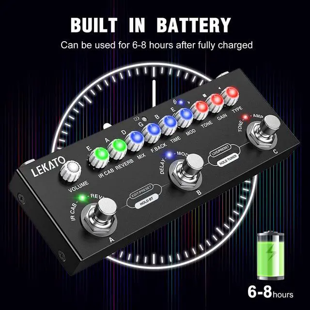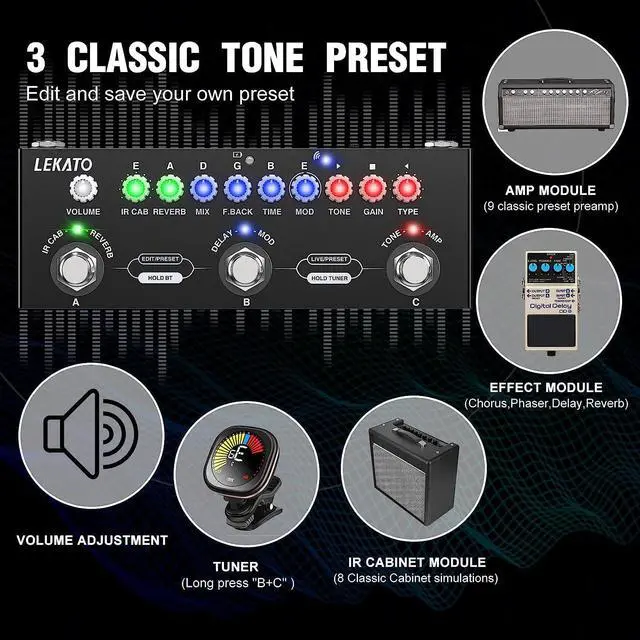 Long press combination foot switch"B"+"C" into TUNER mode, the tuning meter using the parameter knob light on the host panel to display the tuning of the tone and instant pitch.