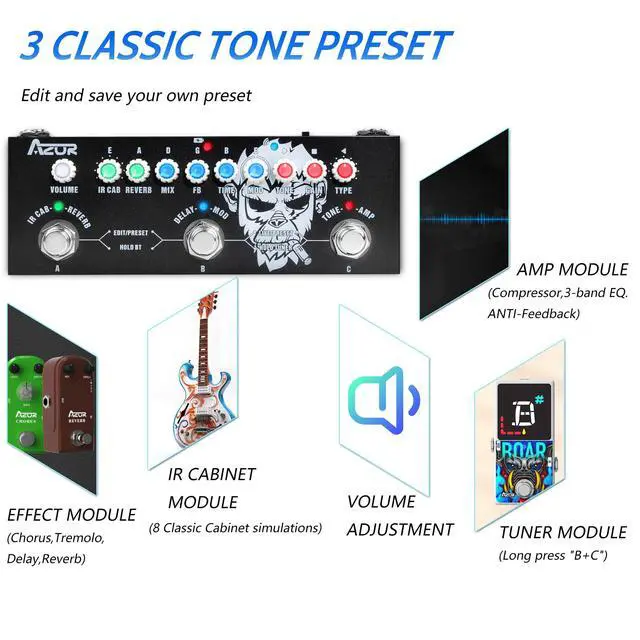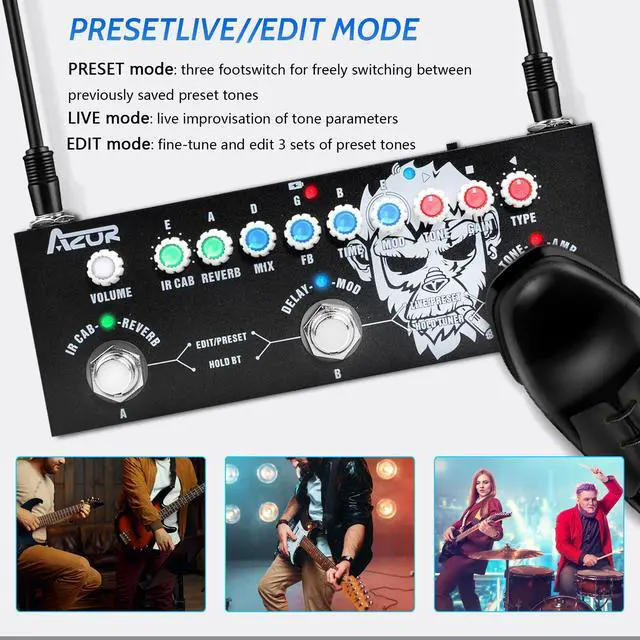 The AZOR Multi Effects Guitar Pedal enables easy preset switching via three modes for fast access during performances. Its intuitive footswitch and touch controls ensure seamless preset changes, while Live Mode supports custom preset
