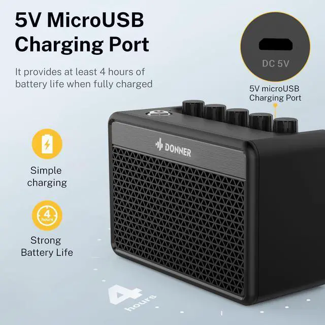 The DA-10 can play for up to four hours at a peak output of 5 watts.Even so, its tiny design makes it easy to handle with one hand.You can go everywhere with this mini amplifier, just plug and play. Now, you can play electric guitar anytime and anywhere, that so cool and fun.