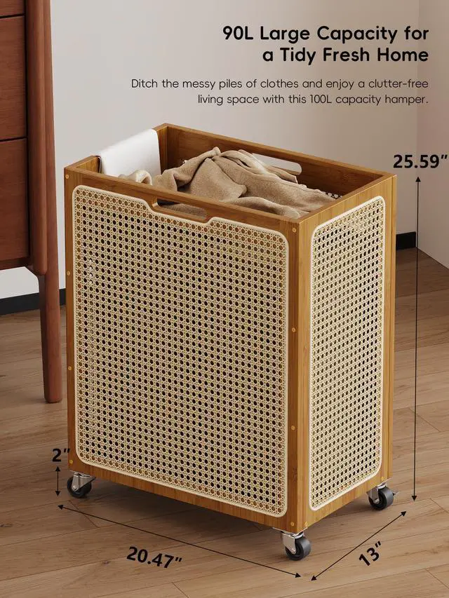 Our Bamboo & Rattan Laundry Hamper is ideal for laundry storage, toy organization, and home gym gear storagecombining style, durability and versatility to simplify routines for busy homes and small apartments. Made of high-quality bamboo and rattan, it features a sturdy frame, breathable weave (prevents odors), 360° swivel wheels, built-in handles, wide open top and spacious interior for laundry, toys or gear. Versatile: use as a bedroom laundry hamper, playroom toy bin, home gym organizer or linen bin. Its natural design matches most decor, blending practicality with style. Low-maintenance (damp cloth/soft brush) and durable. 24/7 online supportcontact us for assembly/use issues, well resolve promptly for your satisfaction. This hamper saves time, reduces clutter, adds elegance, and adapts to your needs as a functional storage solution.