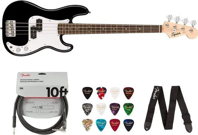 Squier by Fender Mini Precision Bass (Laurel, Black) Bundle with Fender 10ft Cable (Straight/Straight), Fender Guitar 12-Pack Picks, and Fender 2" Guitar Straps