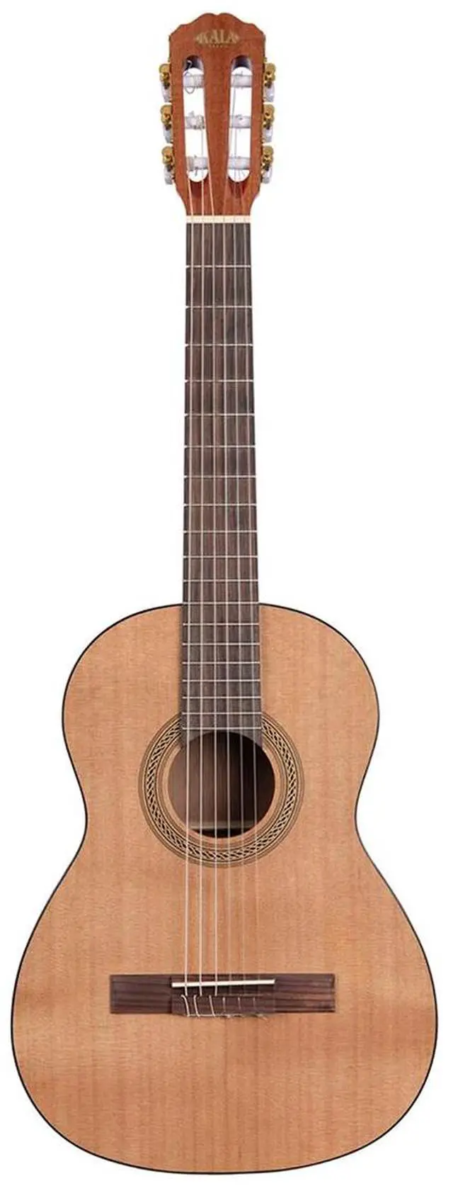 The Kala Student Guitar presents a familiar classical guitar look and feel with the guarantee of Kala quality and affordable price our ukuleles are known for - now at a larger scale. Cedar top, mahogany back, sides & neck with a gloss finish, the Kala Student Guitar features a stylized rosette and slotted headstock with a pairing of Gold and Mother of Pearl style tuning machines. With comfortable action and a clear, mellow tone, the Kala Student guitar packs immense playability into a beginner price, providing the right foundation for growth and development for a brand new player.