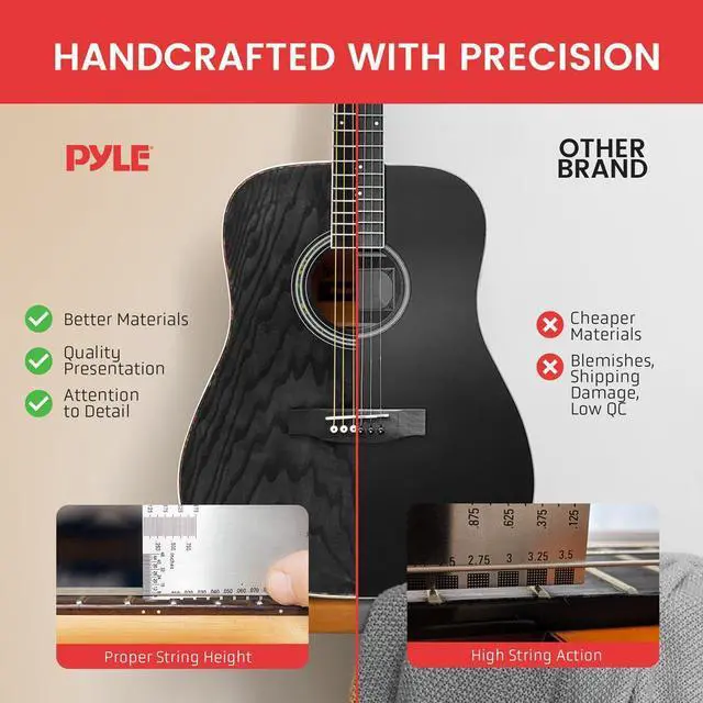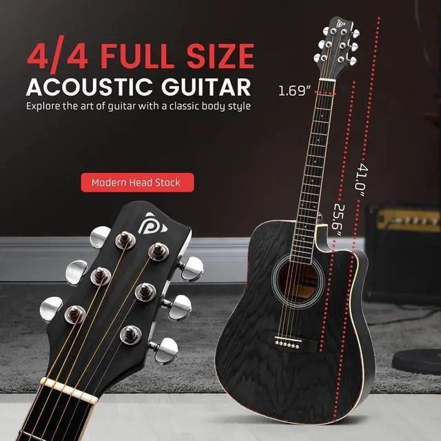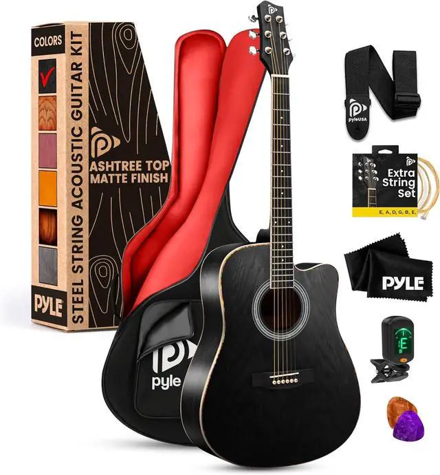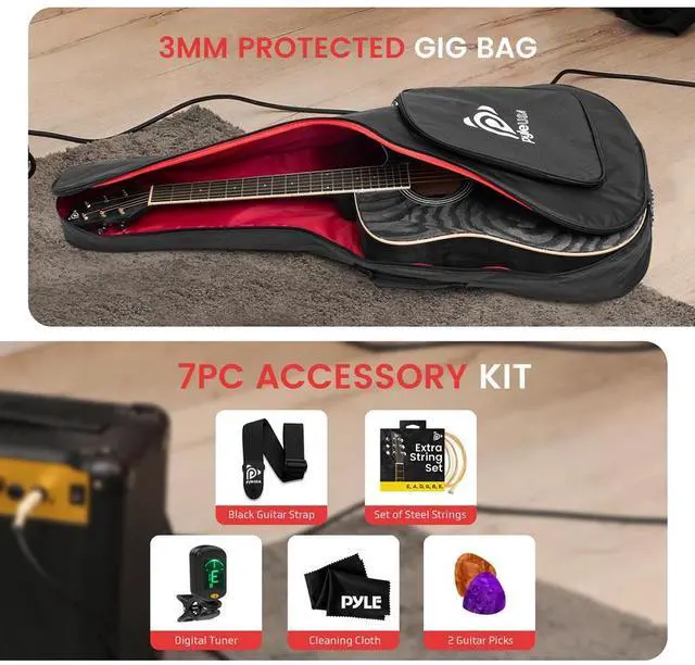 This complete bundle includes a clip-on digital tuner, a black guitar bag, a black guitar strap, an extra set of steel strings, two guitar picks, and a cleaning cloth. Whether youre a beginner looking for your first instrument or a seasoned player in need of a backup guitar, the Pyle PGA480BK Acoustic Guitar Kit has everything you need.
