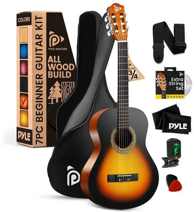 The Pyle PGACLS82SBD is a 36" 6-string nylon string acoustic guitar with a 3/4 scale size, ideal for children and beginners. Featuring a classic slim body sunburst style, this guitar is hand-crafted from durable wood and features a high-gloss polished body. The rosette linden laminate finish provides a stylish and professional appearance. The guitar features soft-playing nylon strings that are easy to press, making it comfortable for new learners to play. The set includes everything you need to start playing, including a travel gig bag, spare strings, a digital tuner, pearloid picks, and a detachable nylon shoulder strap.