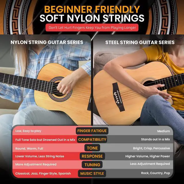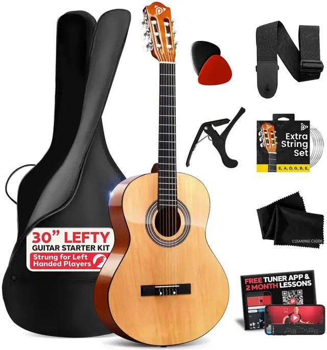 Crafted for left-handed players, the PGACMS30LFT. 5 30 Acoustic Classic Guitar ensures comfort and quality with every strum. The guitar comes in a sleek design and includes all the essential accessories: a black guitar bag, a set of strings, three guitar picks, a black metal capo, and a black guitar strap. Whether you're just starting out or advancing your skills, this left-handed guitar offers everything you need to create music in style.