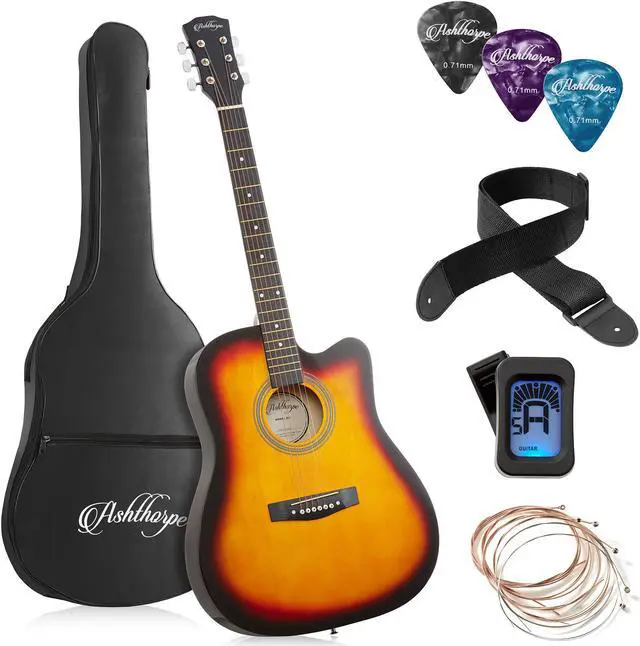 Perfect for beginners! This full size acoustic guitar arrives ready-to-play, right out of the box! This complete kit includes 41-inch guitar, nylon storage bag, shoulder strap, digital tuner, an extra set of 6 steel strings, 3 picks (of assorted colors), and an instructional sheet. The traditional, classic body style is great for students and teens learning to play guitar. Designed with superior-grade tonewoods, the top, back, and sides are crafted from linden for versatility and warmth with a high-gloss finish for a polished and professional look.