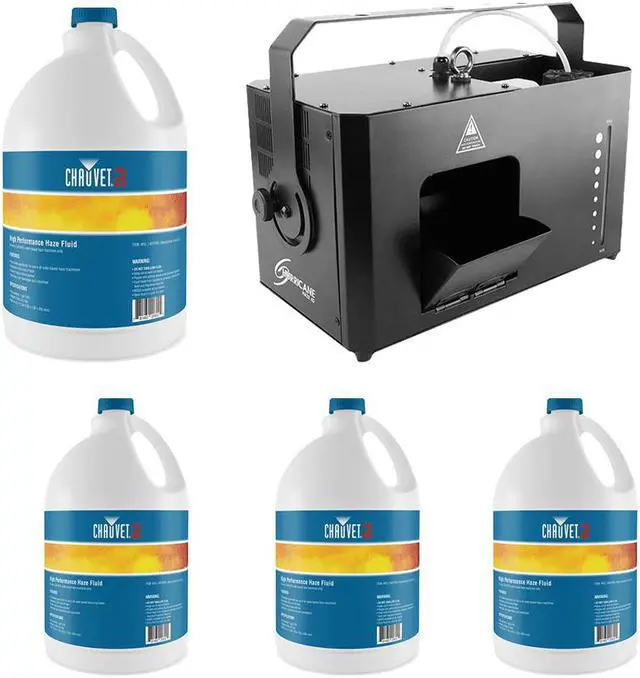 CHAUVET DJ HHAZE4D Overview The Hurricane Haze 4D by Chauvet is a water-based, high-output haze machine designed to create subtle atmospheres to enhance the visual effects of light beams on dance floors, in concerts, at Halloween events, and more. Capable of dispersing haze with a continuous output of 4300 ft³/minute, this unit fills large rooms quickly. The built-in adjustable scoop allows you to control the direction of the haze, while the low-noise fan makes this machine ideal for use in quiet environments. For standalone operation, two built-in knobs allow you to conveniently regulate the haze volume and fan speed.