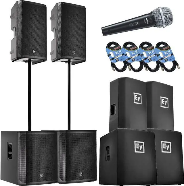 (2) Electro-Voice ELX200-15P, (2) EV ELX200-18SP, (2) ELX200-15P Covers, (2) ELX200-18SP Covers, (2) Poles, SV100 Mic, (4) XLR Cables Bundle
