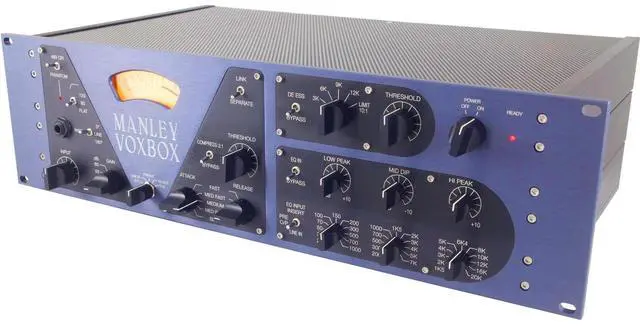 The VOXBOX Combo Tube Channel Strip from Manley Labs is a signal processor with mic preamp, compressor, EQ, and De-Esser/Limiter. While the unit can be used as a single input channel strip, it can also process 2 independent audio signals; one through the mic preamp/compressor and the other through EQ/De-Esser/Limiter. The original design idea was intended for vocal processing. However, the VOXBOX also excels at processing drums, guitar, bass, and stereo mixes.