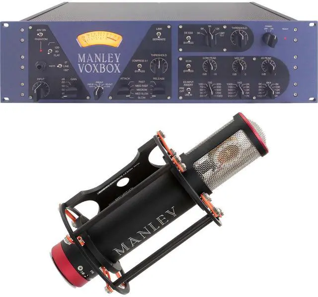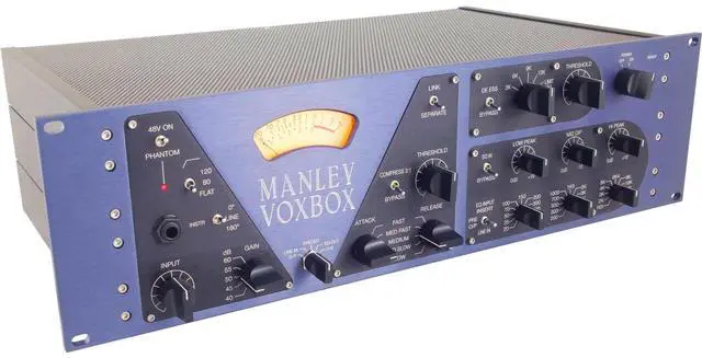 The VOXBOX Combo Tube Channel Strip from Manley Labs is a signal processor with mic preamp, compressor, EQ, and De-Esser/Limiter. While the unit can be used as a single input channel strip, it can also process 2 independent audio signals; one through the mic preamp/compressor and the other through EQ/De-Esser/Limiter. The original design idea was intended for vocal processing. However, the VOXBOX also excels at processing drums, guitar, bass, and stereo mixes.
