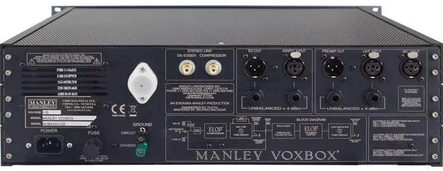 The VOXBOX incorporates many of Manleys technological innovations including the preamp from the Mono Mic Preamp, an electro-optical ELOP compressor, a Pultec-style mid-EQ, and a dedicated ELOP de-esser/limiter. The mic preamp features a hand-wound iron transformer with nickel laminations, negative feedback gain circuit, and triode vacuum tube circuit. The ELOP compressor is an electro-optical limiter with a fixed ratio of 3:1. The attack, release and threshold knobs adjust 4 different time constraints simultaneously resulting in parametric compression, which allows for a broad spectrum of professional results for any vocal, instrument, or mix bus signal.