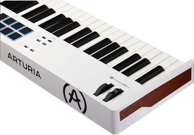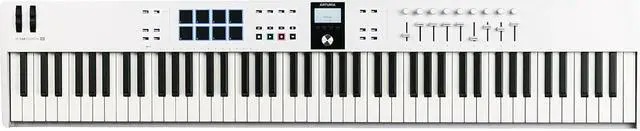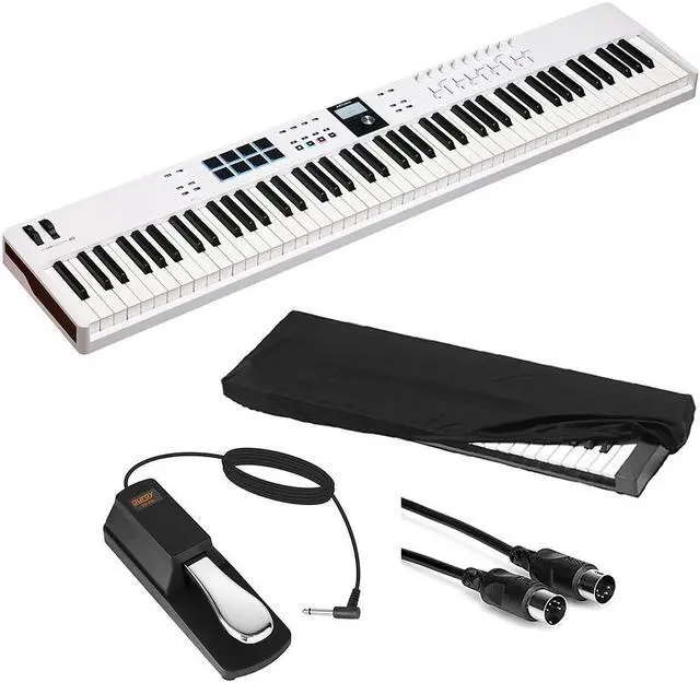 Arturia offers all the celebrated KeyLab features for DAW production and live performances. Sporting 88 semiweighted velocity-sensitive keys and a huge bundle of software, the KeyLab Essential 88 lets you hit the ground running. The KeyLab Essential 88 features all the intuitive controls of the KeyLab Essential line, including eight velocity- and pressure-sensitive pads with RGB backlighting, nine faders and encoder knobs, transport controls, pitch and modulation wheels, and a bright 2.5" LCD screen. You also get built-in controls for Scale and Chord modes, plus an arpeggiator for easy and fast production work. The KeyLab Essential keyboards integrate seamlessly with DAWs for instant control, no menu diving. Over 2000 presets are included with the free Analog Lab Pro software, and the keyboard also includes UVI Grand Piano and NI The Gentleman Piano virtual instruments, and Ableton Live Lite, plus subscriptions to Loopcloud and Melodics. This keyboard includes a USB-C cable. Bundle with Auray FP-P1L Universal Piano-Style Sustain Pedal, Hosa Mid-310 Black 10 ft. Midi cable and Kaces KKC-LG Stretchy Keyboard Dust Cover, large.