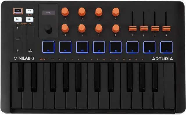 From the great-feeling keyboard, to the smart DAW-integrated pads and faders, to the real-time mini display, every aspect of MiniLAB 3 is designed to be intuitive, expressive, and a joy to use for beginners and pros alike.
