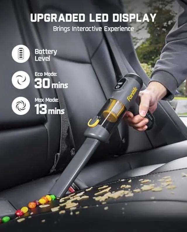 LED Display & Battery Indicator: The handheld vacuum cordless has an LED display screen. Press and hold for 1 second to power it on or off. When turned on, the LED display screen shows the current battery level and suction mode, providing a smarter