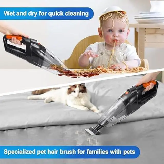 Wet and dry Cleaning: This portable vacuum can handle both wet and dry messes, great for dealing with kids' after-dinner crumbs, this portable vacuum cordless can also help you with pet hair and litter on sofas and floor stalls.