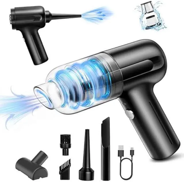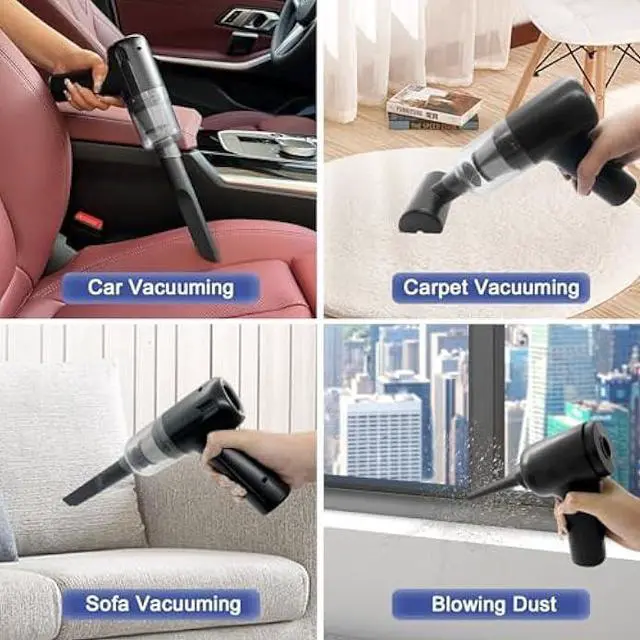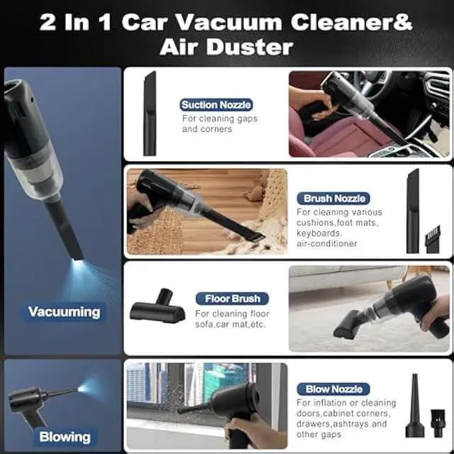 VACUUM CLEANER & AIR BLOWER 2-IN-1Adopted to advanced 2-in-1 technology of blowing and suction, this Car Vacuum Cleaner is very helpful for you. It not only can suck the dust in but also to blow them away. Our 120W high power handheld cordless vacuum has powerful suction up to 6000PA, which is enough to meet your cleaning needs for dust, debris, sand, pet hair and some difficult-to-clean debris in the car or home.