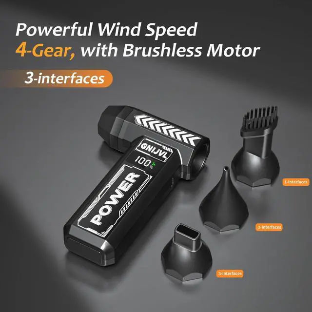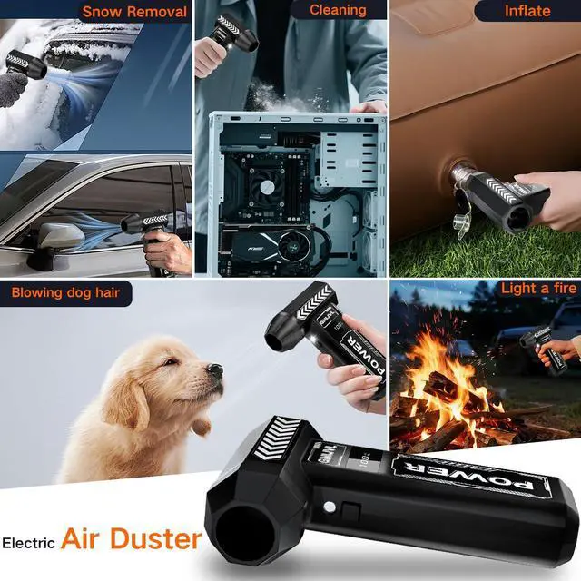 Multi-Scene Cleaning & Versatile Attachments Comes with 4 specialized nozzles (flat, brush, extended, and concentrator) to tackle dust in hard-to-reach areas. Use it as a PC duster for CPUs and vents, a car air duster for dashboards and seats, or even a mini snow blower for light debris. Ideal for home offices, studios, workshops, and automotive care.