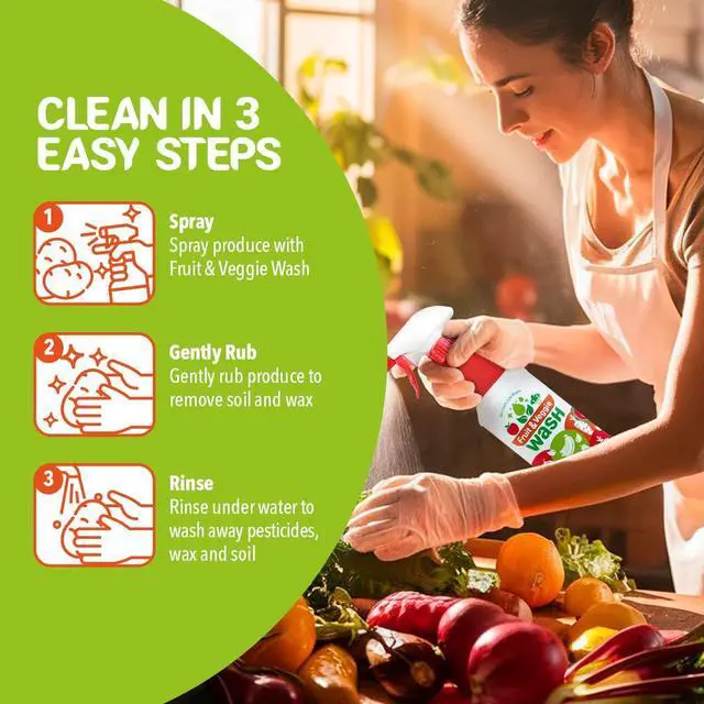 Spray the Fruit & Veggie Wash on your fruits and vegetables, rub gently to cover all surfaces, then rinse thoroughly under running water. This removes residues, wax, and pesticides, making your produce clean and safe.